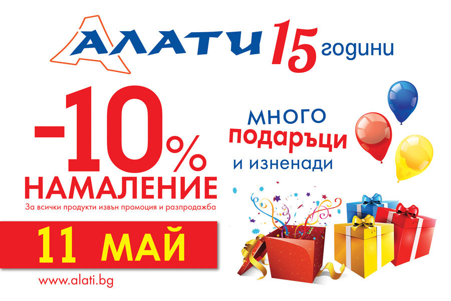 Много подаръци и 10% намаление от цените на всички продукти извън промоции ще получат на 11 май (събота) посетителите на строителен хипермаркет „Алати“. Поводът е петнайстата ни годишнина. Всеки клиент направил покупка над 800 лв. ще получи отстъпка 15%. На всеки 1 час през целия ден, от 8.30 до 20.00ч., ще раздаваме предметни награди. Косачка, шатра, маса с четири стола, душ комплект, мивка и бойлер са само част от подаръците, които ще бъдат раздадени по случай рождения ден на „Алати“. Награди ще бъдат изтеглени с „Колелото на майстора”, което е главен инструмент в раздаването на подаръци и е традиция за „Алати“.