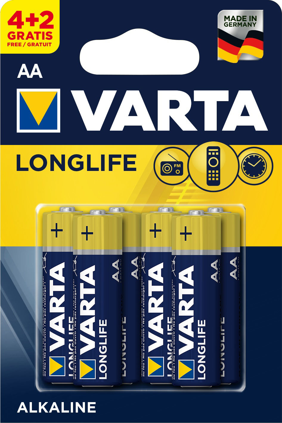 Батерии алкални VARTA LONGLIFE EXTRA 4+2бр. АА -Алкални батерии за устройства с ниска консумация на енергия (часовници, дистанционни управления, фенери). Благодарение на новата си формула с оптимизирано примесване на мангановия диоксид се подобрява издръжливостта на устройствата с ниска консумация.