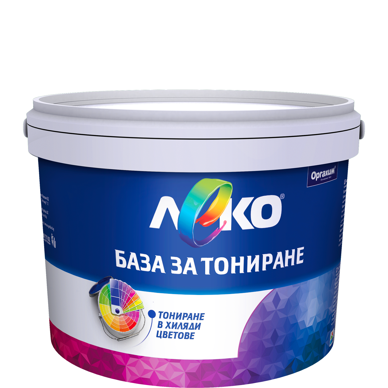Леко база за тониране Транспарентна представлява добре хомогенизирана суспензия от фино диспергирани пигменти, пълнители, водоразредимо свързващо вещество и специфични добавки. Употребява се за вътрешно и външно боядисване на стени и тавани в наситени цветове Лесно нанасяне – добра разливност и изравняване на мокрото покритие, без пръски при нанасяне Микропорести покрития – oсигуряват “дишане” на стените Много добра покривност Добра устойчивост на мокро триене и миене – клас 1 , съгл. ISО 11998 Бързосъхнеща със слаба миризма Покривност: 9 - 12 m²/L за един слой