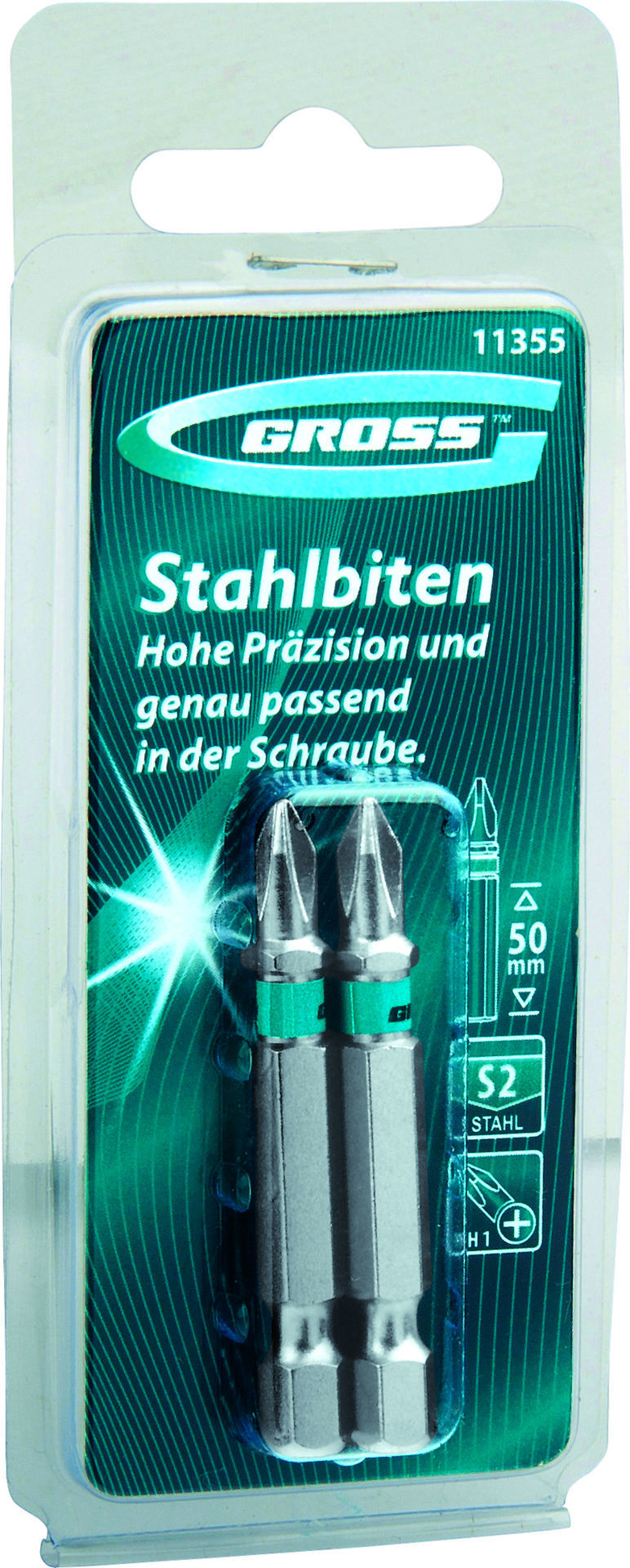 Комплект битове от търговска марка GROSS е предназначен за използване в качеството на приставки в ръчния и механичен инструмент. Направени са битове от висококачест вена инструментална стомана от марка S2. Твърдостта на бита е 58-62 HRС. Основата на бита представлява 6-стенна опашка с размер 0,6 см (1/4 дюйма). Дължината на бита е 50 мм, тип на шлица — PH1 (кръстовиден). В качеството на защита от фалшифициране върху всяка бита присъства цветен пръстен с лого с търговска марка GROSS. Комплект от два бита е опакован в твърда термоформована лентъчна кутия (double blister) с размер 120×50 мм.