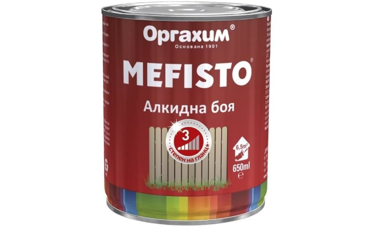Mefisto Алкидната боя е предназначена за декоративна защита на повърхности от метал и дърво в неагресивна среда, експлоатирани на закрито и открито при нормални атмосферни условия. -Сатенено покритие; -Лесно нанасяне; -Разнообразие от красиви цветове.