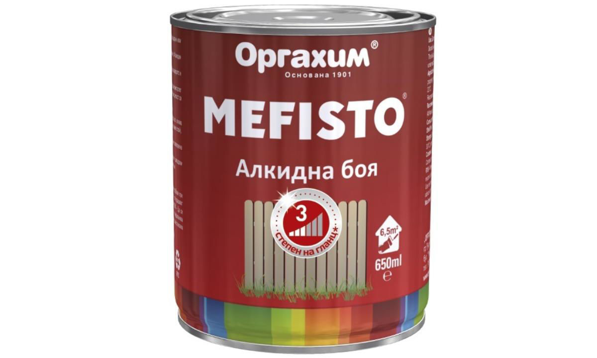 Mefisto Алкидната боя е предназначена за декоративна защита на повърхности от метал и дърво в неагресивна среда, експлоатирани на закрито и открито при нормални атмосферни условия. -Сатенено покритие; -Лесно нанасяне; -Разнообразие от красиви цветове.