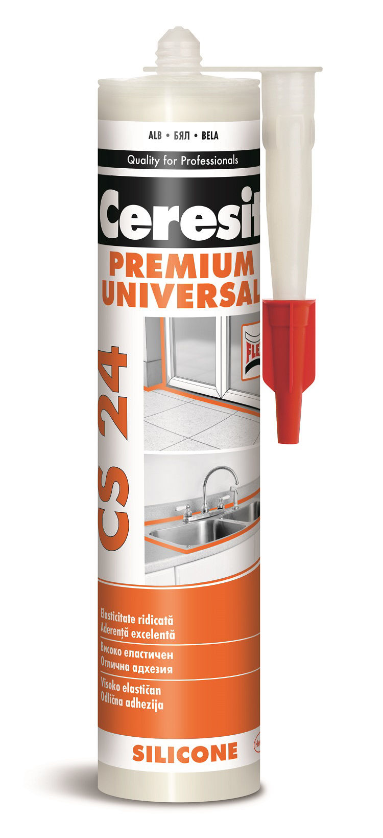Ceresit CS 24 - универсален силикон бял 280мл - за уплътняване на стъклени прозорци и врати, стъклени вани, мивки, за фугиране на керамични порития на стени и подове; за употреба на закрито и открито; високоеластичен; не се свива и не променя цвета си; устойчив на влага, стареене и UV лъчи; с фунгицидно действие;