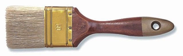Плоска четка с бял косъм микс и дървена лакирана дръжка; широчина - 80мм; косъмът е прикрепен към тялото чрез ламаринен обръч; четката е клас 9 и с 60% връх; подходяща е за нанасяне на фасадни бои;