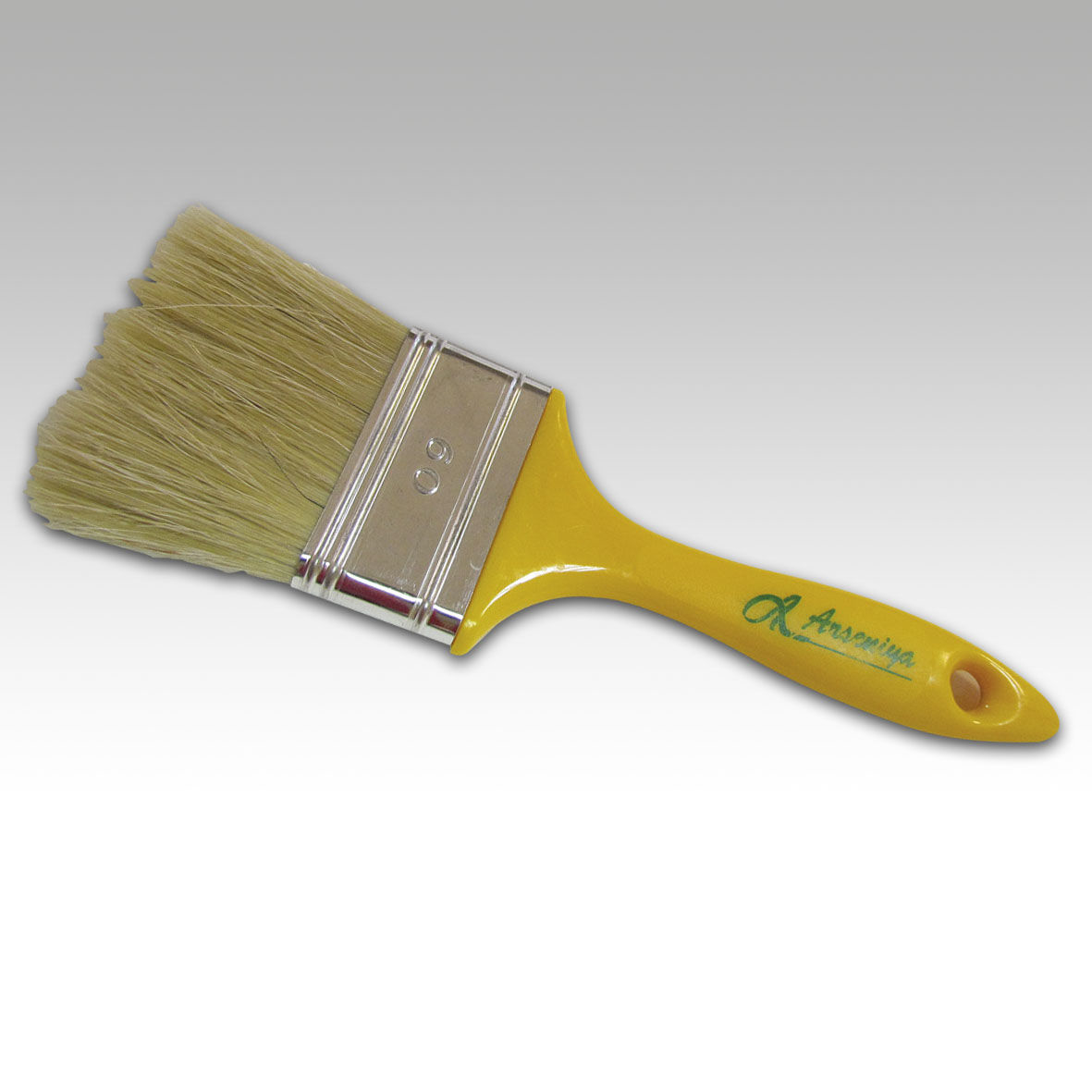 Бяла естествена четина.Дръжка тип"Pennelesa"пластмасова.Никелирана пластина.Предназначена за боядисване с всякакъв вид бои.Устойчива на разредители.