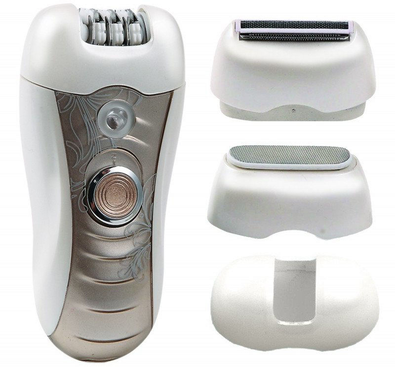 Епилатор 4 в 1 взимозаменяеми епилиращи/ бръснещи/ почистващи глави Акумулаторни батерии - 2 типа епилация - пилинг за загрубяла кожа - самобръсначка Индикаторна лампичка 8 часа зареждане/ 35 минути работа 230V/ 50 Hz