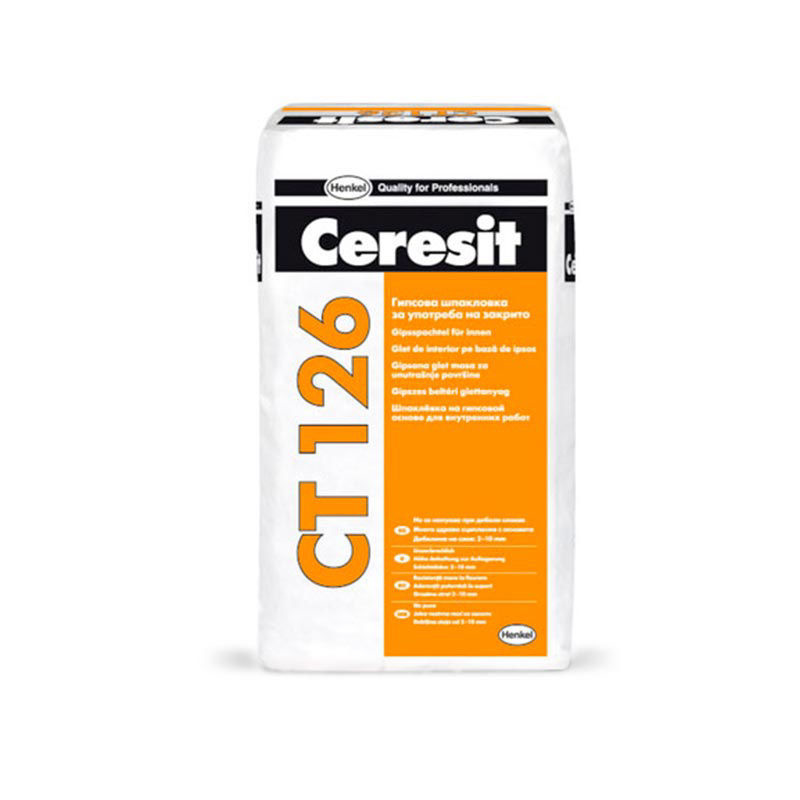 При започване на ремонт, едно от първите неща е шпакловането на стените, затова е много важно да се направи правилният избор на марка и продукт. Ceresit CT126 е гипсова шпакловка идеално приложима за стени и тавани от бетон (предварително измазани или грундирани), зидария, газобетон и строителни плочи. Гипсовата шпакловка CT126 е подходяща и за употреба върху гипсокартон, филц, декоративни гипсови или стиропорни елементи. Ceresit CT126 е идеалният избор за полагане на закрито, като дебелината на слоевете е до 10 mm. Огромен плюс при избора на тази шпакловка е, че не се напуква при дебели слоеве, има кратко време на набиране на якост и висока сила на сцепление. Има висококачествен бял матов вид при завършване, което ще допринесе за по-чистия цвят на нанесената боя. Ceresit CT126 е икономичен, защото има дълго време на употреба на готовия разтвор, както и ориентировъчен разход - 1,2 кг/1кв.м за 1мм дебелина на слоя. Изключително ефективен е при различни температури на работа в диапазон от +5С до +30С;