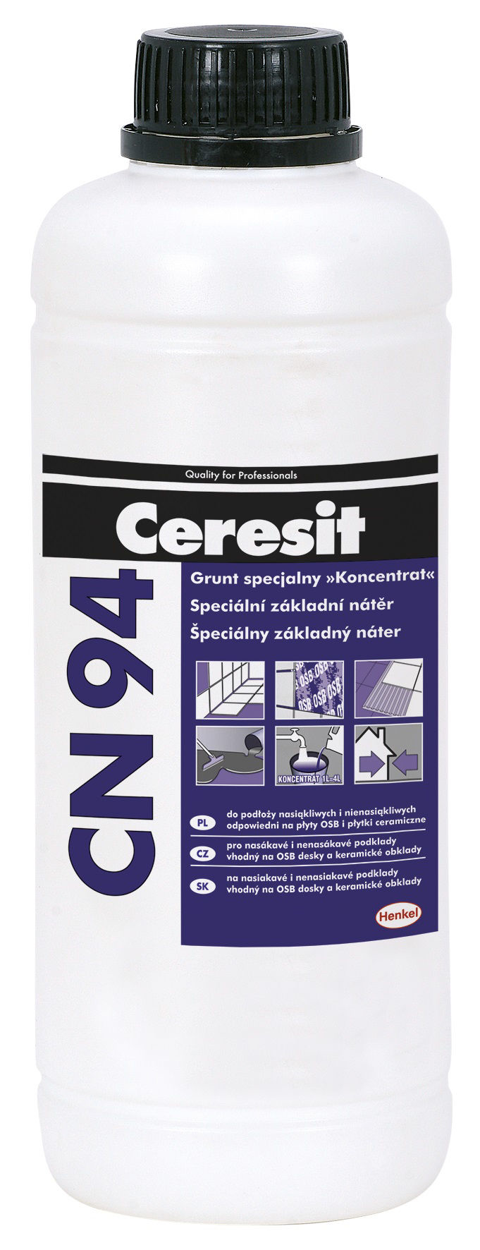 Ceresit CN94 1 л. - специален грунд за критични основи, концентрат; здрав грунд за надеждно свързване на изравняващи замазки, керамика и естествен камък върху чувствителни повърхности; за попиващи и непопиващи основи; Разрежда се в съотношение 1:3 грунд-вода; върху дървени повърхности и основи от лят асфалт се използва в неразреден вид; здраво залепване; силно укрепващо действие; импрегниращо действие; Ориентировъчен разход: 30-120гр на кв.м, според приложението.;