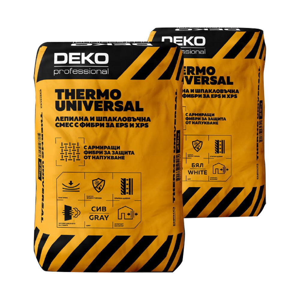 Деко Thermo universal е лепилна и шпакловъчна смес, съдържаща фибри за лепене и шпакловане на топлоизолация от EPS и XPS (експандиран/екструдиран полистирен, експандиран полиуретан, корк и др.). Лепилната и шпакловъчна смес за топлоизолационни плоскости може да се приложи ефективно върху стени или тавани директно върху мазилка, зидария или бетон, без свличане, което я прави мощен помощник в основния ремонт на дома. Тя е идеалният избор за шпакловане на термоизолационни панели с вмъкване на армираща мрежа от фибростъкло на вътрешни и външни стени (външна изолация). Огромен плюс при избора на лепилната и шпакловъчна смес с фибри е, че съдържа водоотблъскващи добавки, като прави повърхността хидро и мразоустойчива. Сместа е лесна за обработване, без да променя формата си или да се свива при втвърдяване.
