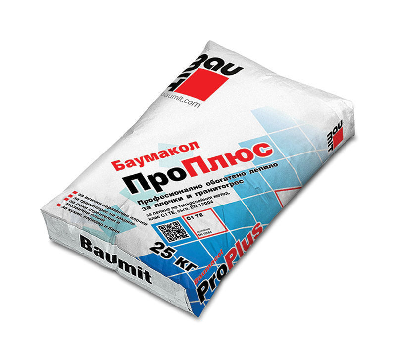 Лепилото Баумакол ПроПлюс е професионално лепило с обогатена формула за лепене на фаянс, теракот и гранитогрес. Изключително подходящо е за леки строителни и мозаични плочи за кухня, коридор или банята. Професионално лепило, което в домашни условия служи за монтаж на всякакви плочки и камъни. Не се препоръчва само върху подово отопление. Баумакол ПроПлюс е с удължено отворено време до 30 мин. при максимална дебелина на слоя 5мм. и максимално време на ползване на готовия разтвор до 4 часа. Със своята мощна формула лепилото осигурява подобрена тиксотропност и водо- и мразоустойчивост и е подходящо за нанасяне върху бетон, циментови и анхидритни замазки, циментови и гипсови мазилки, гипсо-картонени плоскости, както и други видове минерални основи.