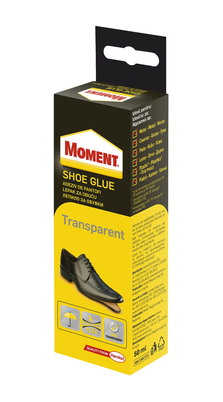 Moment Shoe Glue e прозрачно контактно лепило за огромно разнообразие от материали; за комбинирано лепене на: дърво, фурнир, пластмаса, стъкло, гума, кожа, корк, филц, твърдо PVC, пенопласт, метал и др; лепилото се нанася и на двете основи, изчаква се 12-15 мин, след което се притиска силно; изключителна термоустойчивост: от -40°C до +70°C.; не съдържа циклохексан (СС6 free); не капе; температура на работа от +18С до +25С; не е подходящо за стиропор, полиетилен, полипропилен, изкуствена кожа.; Разход: 250-350 g/m2 при двустранно нанасяне;