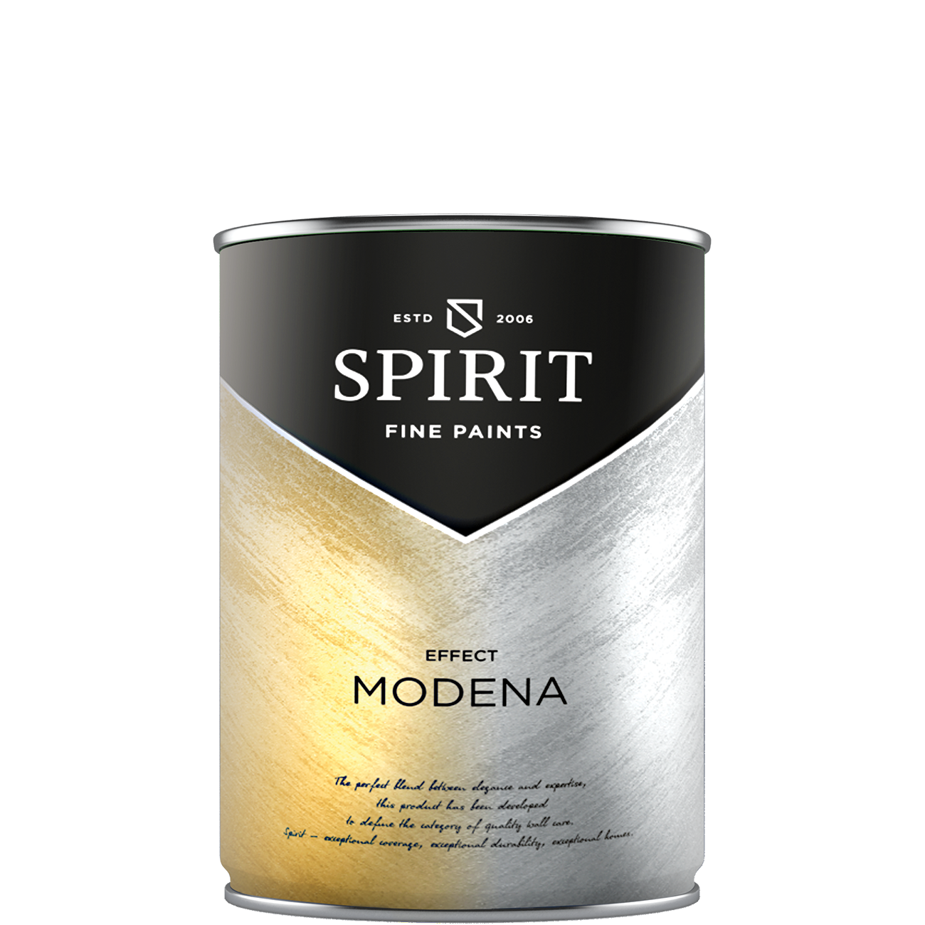 Spirit Effect Modena е интериорна ефектна боя на водна основа, с перлени пигменти и кварцов пясък в златист цвят. Продуктът е предназначен за ново боядисване и възстановяване на стени и тавани. Притежава: - Добро поведение при нанасяне - Добро поведение при съхранение - Отлична покривност; -Висока износоустойчивост; - Лесна за поддържане и почистване