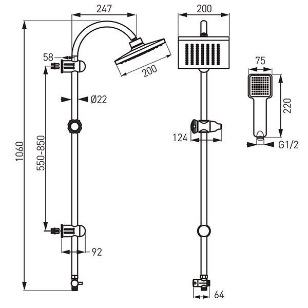 - размер на надземния душ 200 х 200 мм