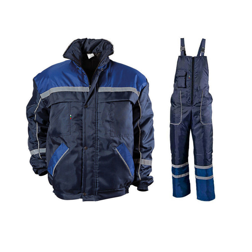 Зимен ватиран комплект- работно яке със сваляща се качулка и с полугащеризон. Закопчаване на якето с цип и тик-так копчета, ластичен маншет на ръкавите. Презрамките на полугащеризона са с възможност за регулиране. Светлоотразителни ленти на якето и на полугащеризона. , МАТЕРИАЛ: полиестер