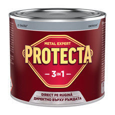 PROTECTA 3in1 е продукт за защита на черни метали от атмосферни влияния, произведен с висококачествени алкидни смоли. Употребява се за декорация и защита на нови и ръждясали повърхности от черни метали – врати, парапети, огради и др. -3in1 – преобразувател на ръжда, грунд и декоративно покритие; -Лесно нанасяне и много добра покривност; -Нанася се директно върху ръждата; -Пълна атмосфероустойчивост; -Покритието издържа тест от 300 часа на солена мъгла.