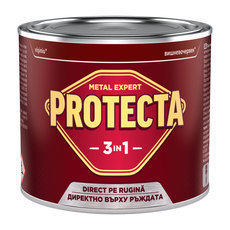 PROTECTA 3in1 е продукт за защита на черни метали от атмосферни влияния, произведен с висококачествени алкидни смоли. Употребява се за декорация и защита на нови и ръждясали повърхности от черни метали – врати, парапети, огради и др. -3in1 – преобразувател на ръжда, грунд и декоративно покритие; -Лесно нанасяне и много добра покривност; -Нанася се директно върху ръждата; -Пълна атмосфероустойчивост; -Покритието издържа тест от 300 часа на солена мъгла.