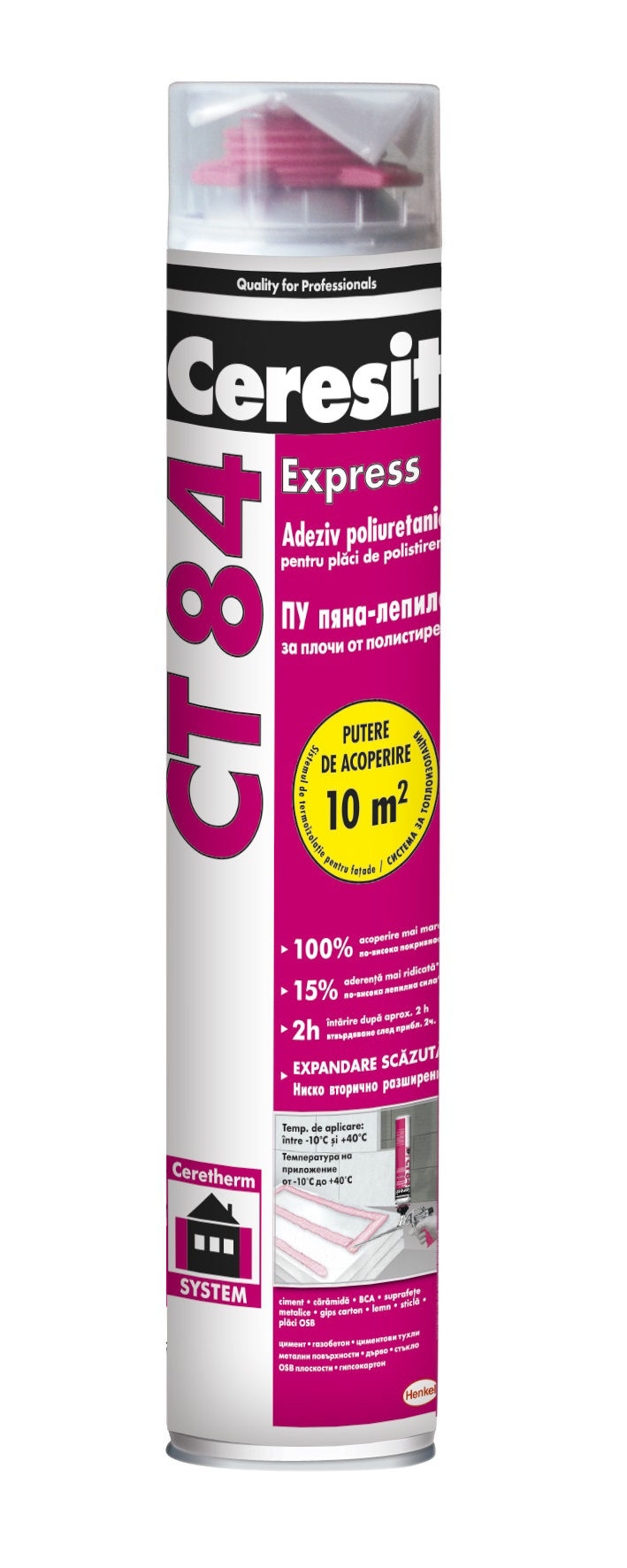 Ръчна PU-пяна лепило, 750мл - за лепене на плоскости от EPS и за запълване на фуги между тях; ниско вторично разширение; втвърдяване след 2 ч.; покривност - до 8кв.м; 15% по-висока лепилна сила, спрямо циментовите лепила; за работа при температури от 0 градуса;