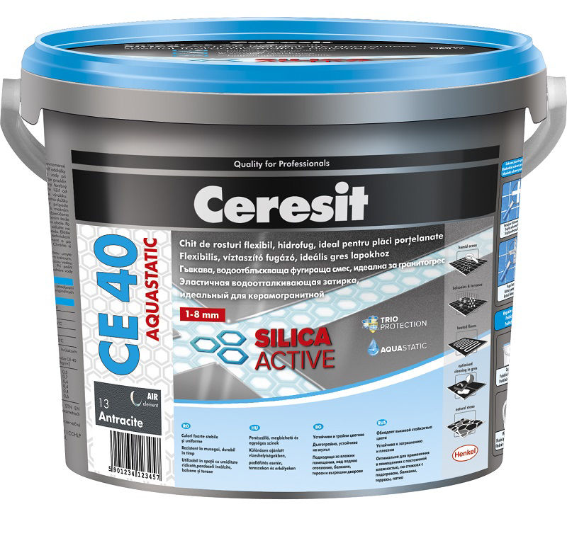CE 40 AQUASTATIC фугираща смес, гъвкава, аквастатична (0-8 mm) 2 кг; Цвят - карара; за широчина на фугата до 8mm, с технологията SILICA ACTIVE, формула COLOR PERFECT, устойчива на замърсяване и надраскване, идеално гладка, запазва трайно цвета си, за употреба над подово отопление; за фугиране на подови настилки и стенни облицовки от гранитогрес, керамични, стъклени и каменни плочки (вкл. и мрамор) на закрито и открито; подходяща за бани и душ кабини, както и за фугиране на плочки, залепени върху гипсокартон, ПДЧ и OSB плоскости; БДС EN 12004: CG2ArW