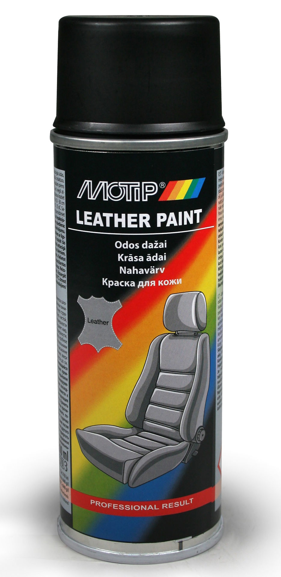 MOTIP Спрей за кожа и винил - черен, 200мл - бързосъхнещ пластичен спрей-боя за възстановяване и боядисване на естествена и изкуствена кожа, винил; подходящ за салони на автомобили, кожени мебели, чанти, якета и др., основата трябва да бъде чиста, суха и обезмаслена, втвърдява се след около 2 часа;