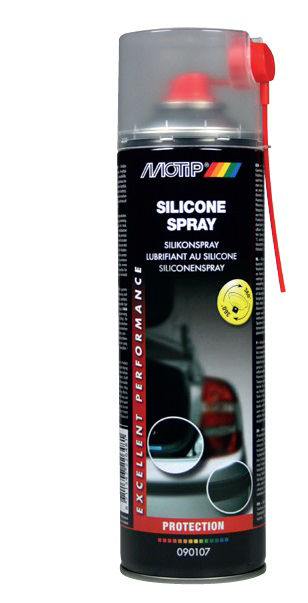 MOTIP Силиконов спрей 500мл - водосутойчив, топлоустойчив, предпазващ от ръжда; устойчив на температури от - 50°С до 200°С, атмосферни влияния и слаби киселини и основи; служи за смазване и защита на пластмасови и гумени детайли, като предотвратява напукването и залепването им.; предпазва автомобилните гуми от сол и слънчеви лъчи.; изключително подходящ за изолация, където нанесеният слой трябва да остане гъвкъв за продължителен период от време.;
