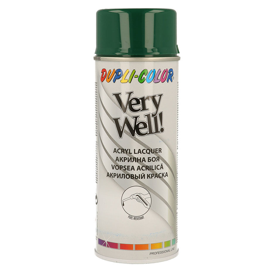 Спрей боя Very Well - RAL 6005 мъхесто зелено, 400мл; бързосъхнеща акрилна боя; цветове по RAL; изсъхва на допир след 10-30 мин; подходяща за нанасяне върху различни повърхности като камък, дърво, плстмаса, метал и стъкло; изключително устойчива на атмосферни влияния, бензин и масла;
