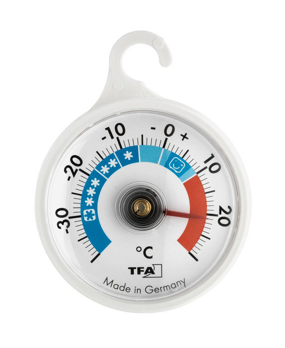 Хладилникът работи ли правилно? Оптимално ли е настроен фризерът? Този термометър има удобни показания благодарение на отпечатаните охлаждащи зони от пръв поглед, независимо дали зеленчуците, сиренето, месото & Co. са правилно охладени. С удобната кука можете лесно може да го закачите във вашия хладилник или фризер. Температурата се измерва с помощта на доказана биметална технология. Продуктът е изцяло произведен в Германия. Код на производител: 14.4005 Корпус: пластмасов Цвят: бял - температурен обхват: -40 до +30 °C - точност: 1 °С - резолюция: 1 °С Размери: O 52х11х68 мм Тегло: 0,009 кг